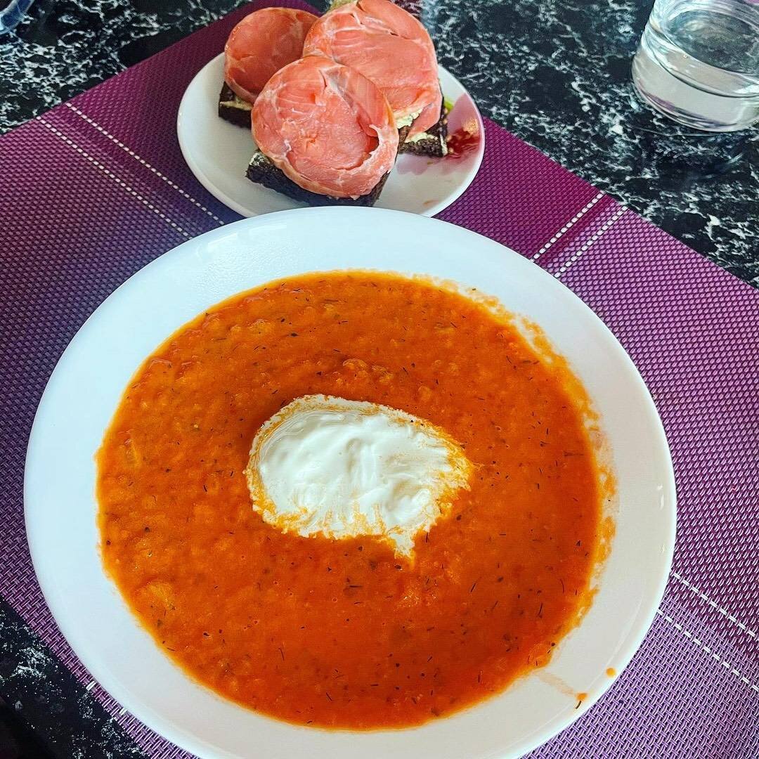 При подаче, добавить страчателлу! Приятного аппетита!❤️ #recepting Ингредиенты: помидоры, лук, чеснок, страчетелла, лист лавровый, базилик , укроп на своё усмотрение, соль и перец , оливковое масло Способ приготовления: Помидоры промываем в воде, выкладываем в глубокую миску, заливаем кипятком и оставляем на 10 минут. После этого резко переместить в ледяную воду. Пока томаты в воде, очищаем луковицу и нарезаем произвольно, у меня мелкие кубики. Прогреваем оливковое масло в кастрюле, пассеровать в нем лук на слабом огне до прозрачности, периодически перемешивая. Чистим помидоры от кожуры и нарезаем средними кубиками. Добавляем к луку помидоры и лавровый лист, минут на 7. Добавляем чеснок, солим, перчим, базилик (у меня сушеный), убираем огонь до минимума тушим 10 минут. Достаём блендер, прежде чем будем измельчать в пюре, нужно вытащить лавровый лист, затем необходимо добавить укроп и прогреть до кипения. Ваш суп-пюре готов!🍅🥰