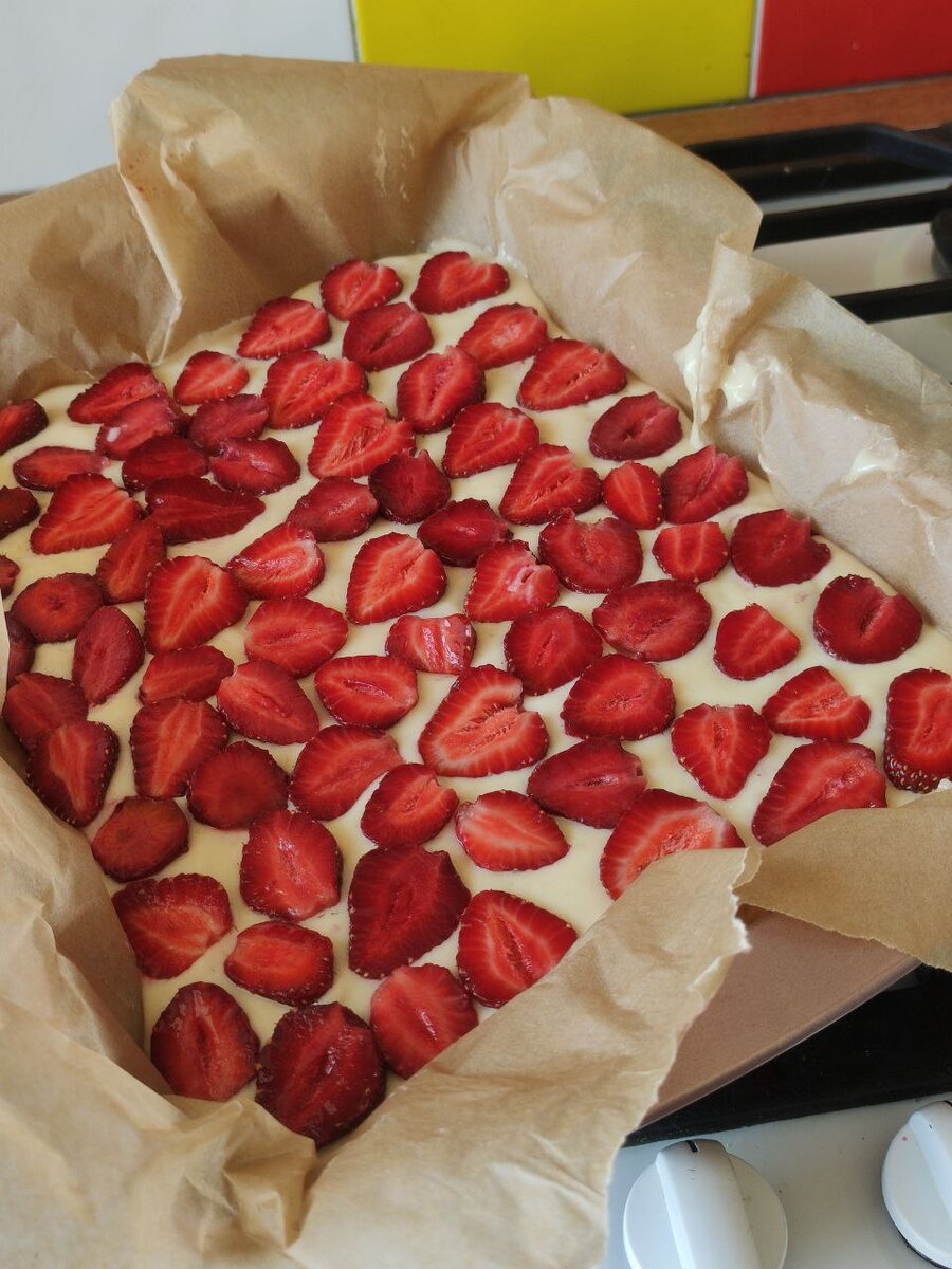 Клубнику моем и режем пополам. Выкладываем срезом вверх.