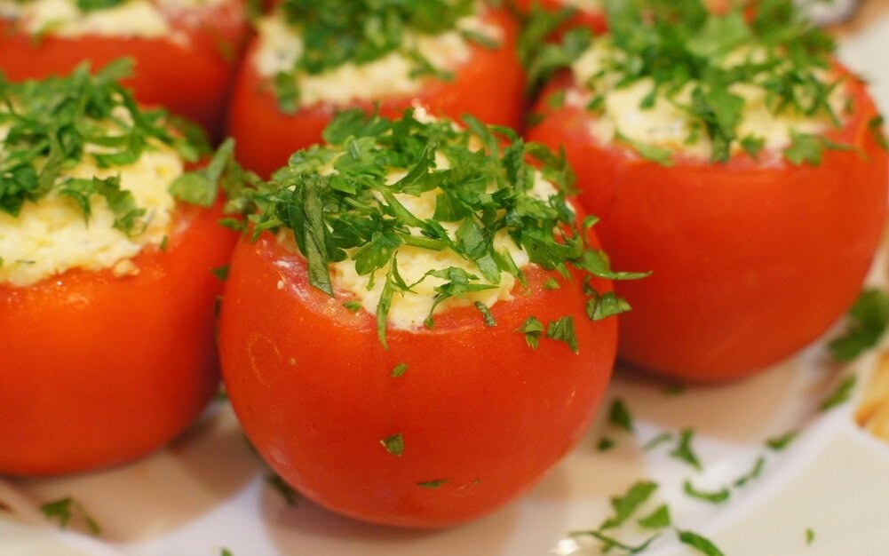Сардины — это рыбки такие, раньше их было завались на прилавках СССР, а теперь ….. Хотя консервов из сардин и сейчас хватает. Вот именно они-то нам и понадобятся. Готовить мы будем помидоры запеченные в духовке с рыбными консервами из которых сначала приготовим крем. Разумеется у нас будет горячая закуска, причем вкусная и простая в приготовлении. Берем 6 помидоров, 250 гр сардин в масле, майонез, лимонный сок, соль, перец и зелень петрушки. У мытых помидор аккуратно срезаем верхушки и больше они нам не понадобятся. Теперь наше дело удалить внутренности помидора, оставив своего рода «бочонок». Сардинам дадим стечь, разомнем, добавим соль, если нужно, перец, 1 ч.л. лимонного сока и майонеза 2-3 столовых ложки. При необходимости можно добавить масло от сардин. Кстати, так даже вкуснее будет. Помидорам дать обтечь изнутри, присолить, можно приправить черным перцем. Заполняем рыбным кремом «бочонки» из помидоров и запекаем в течении 10 мин при 180°С. Готовые помидоры с рыбным кремом посыпа