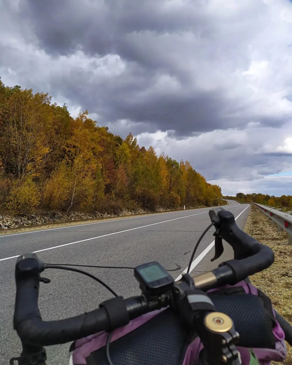 Вчера, когда ложился спать, начинало подмораживать. Как обычно залез глубже в спальник, затянул воротник и капюшон, оставил лишь отверстие для дыхания. А ночью проснулся от того, что стало тепло, пришлось даже расстегиваться обратно и на половину вылезти из мешка, чтоб было комфортно. Утром ни росы ни инея на палатке, значит и правда было тепло. Собрался, выкатился. И только начал раскручивать педали ещё совсем без нагрузки, как левое бедро стянуло судорогой. Пришлось даже слезть с велика. Сел на отбойник, промассировал и потянул мышцу. Спазм от этого проходит, но боль остаётся на весь день, как после хорошего ушиба. Выпил пару таблеток панангина и пошёл пешком. Когда боль немного унялась, сел на велик и начал работать только правой, чтоб левая приработалась без нагрузки. Дальше как-то втянулся. На все манипуляции ушло около часа, так же было и первый раз в Чите. Я списал это на то, что вчера вечером перед сном не промял ноги, как делаю это обычно. Мол, проехал немного, на стоя