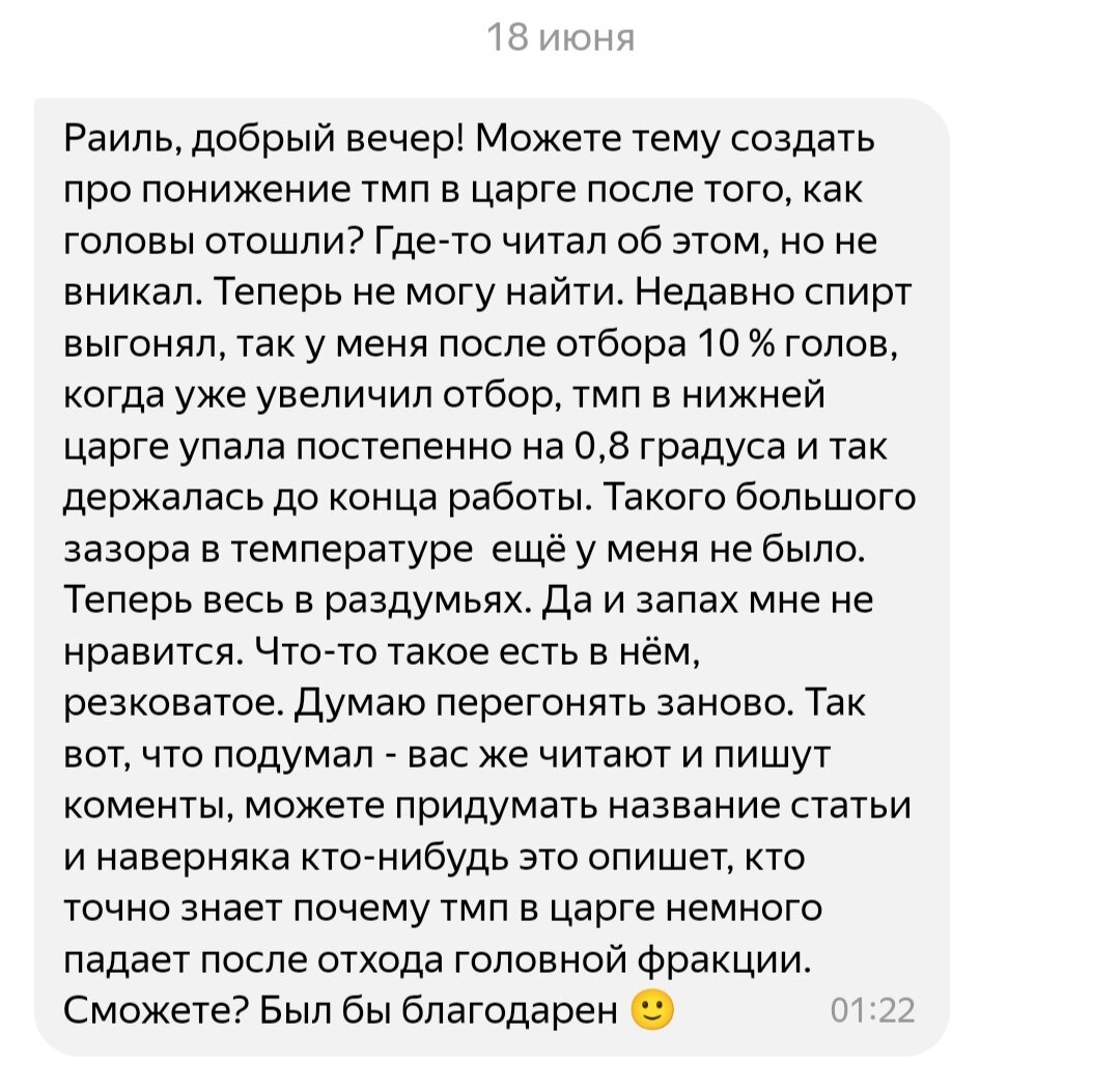 Здравствуйте, друзья! Уважаемые читатели и подписчики. Ко мне в личку обратился один из моих подписчиков, не мог не отреагировать. Вот его обращение: Давайте поможем человеку, выскажете своё мнение на этот счёт. Мои наблюдения. Я в субботу как раз делал ректификацию. Понятно что стабилизацию колонны в счёт не берём. Но в начале отбора голов температура качалась, +/- 0,2 градуса, это считаю вполне нормальным. Ближе к концу отбора голов, температура в царге стояла как вкопанная. После того как закончился отбор голов, температура в царге устаканилась на отметке 77,9 и более не двигалась. Нагрев при отборе голов и тела на одной мощности. Вполне вероятно что температура меняется из-за уменьшения флегмы, так как отбор увеличивается. Здесь явно есть какая-то взаимосвязь. Но хочется услышать ваше мнение, давайте не пройдём мимо и поможем коллеге по ремеслу. Жду ваши версии в комментариях. И ещё! Если у вас есть какие то вопросы, которые вы хотите поднять и получить ответ коллег, пишите мне в