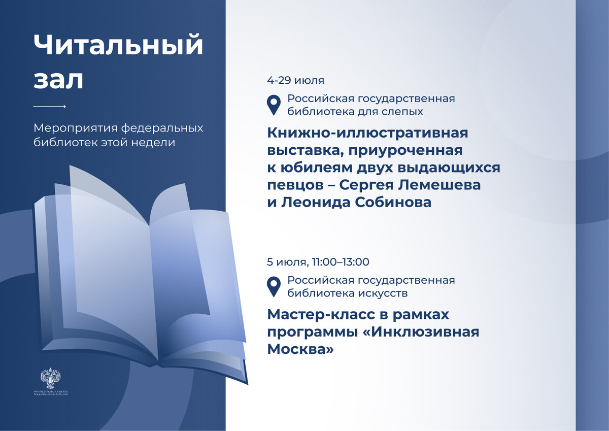 👇🏻 Не пропустите подборку бесплатных мероприятий от федеральных библиотек, которые пройдут на этой неделе. 💌 4–29 июля 📌 Российская государственная библиотека для слепых 📕 Книжно-иллюстративная выставка, приуроченная к юбилеям двух выдающихся певцов – 120-летию со дня рождения Сергея Лемешева и 150-летию со дня рождения Леонида Собинова. 💌 5 июля, 11:00–13:00 📌 Российская государственная библиотека искусств 📕 Мастер-класс в рамках программы «Инклюзивная Москва». 💌 5 июля, 16:00–17:00 📌 Российская государственная библиотека для слепых 📕 «Час чтения – час общения», в рамках которого сотрудники библиотеки прочитают сказки позвонившим юным читателям. 💌 6–27 июля 📌 Российская государственная библиотека искусств 📕 Открытие второй части юбилейной экспозиции с редкими книгами и гравюрами из личных коллекций выдающихся деятелей культуры и театра. 💌 7 июля, 15:00 📌 Российская государственная детская библиотека 📕 Игровое литературное занятие-путешествие «Круиз без виз. Морской се