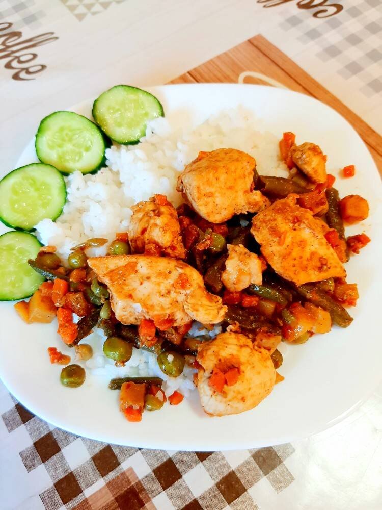 Куриное филе, приготовленное с овощами в остром соусе с гарниром из рассыпчатого риса🍗🌶🍚 #кукпадготовит #курица #обед #ужин #второе #курицапомексикански #вкусно #моёменю #рецептыизкурицы Ингредиенты: куриных бедрышек, морковь, луковица, помидор, стручковой фасоли замороженной, перца чили, зелёного горошка замороженного, соли, приправы Для курицы, орегано, паприки, чеснока, винного уксуса, оливкового масла, петрушка сушеная Способ приготовления: С куриных бёдер снять кожу, и мякоть отделить от костей. Куриное филе порезать и посолить, добавить приправу для курицы🐔. В сковороду наливаем оливковое масло и кладём порезанный лук, затем чеснок и пассеруем все вместе минуты 2-3, затем к ним добавляем порезанную кубиками морковь и обжариваем все вместе ещё минуты 3. Теперь сюда выкладываем подготовленное куриное филе, и обжариваем все вместе в течение 5-7 минут. Теперь добавляем фасоль, горошек, порезанный помидор и перчик Чили, все посолить, посыпать орегано, паприкой и доливаем 1 стакан