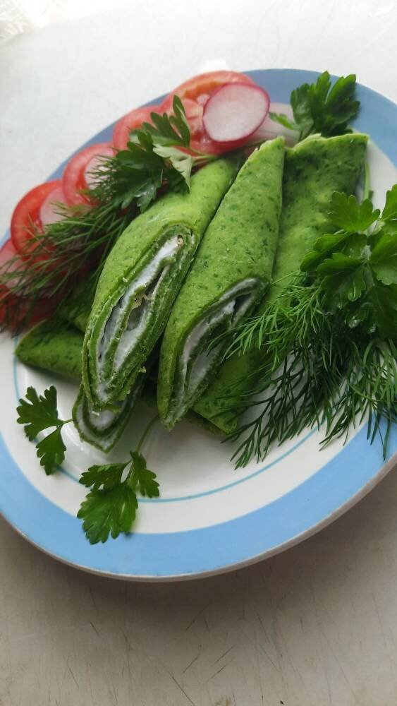 #кукпадготовит Идея отличного завтрака , начинку к таким блинчикам можно на своё усмотрение. Ингредиенты: шпината, молока, яйцо, соли, сахара, сливочного масла, муки (у меня 120 г рисовой) Способ приготовления: Пробить в блендере листья шпината и молоко. Яйца смешать с солью, сахаром и добавить к молочной смеси. Добавляем растопленное сливочное масло и муку. Перемешиваем до однородности. Жарим с 2 сторон на среднем огне. Начинку можно творожный сыр и мягкий творог, зелень и овощи подаём с блинами.