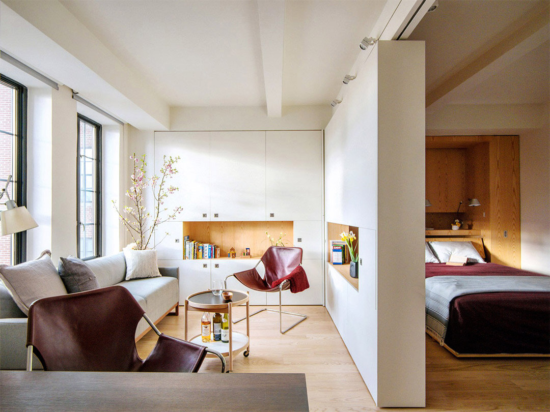 В подвижной стене несколько систем хранения, как простые ящики, так и места для хранения одежды. В центре стены предусмотрено окно, которое можно открыть для попадания естественного света из гостиной в спальню. В квартире 6 спальных мест (1 кровать и 2 раскладных дивана).