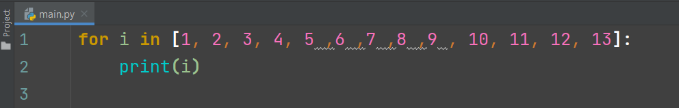 В примере выше написана программа с использованием цикла for. Мы указываем, что наша вложенная инструкция print(i) должна выполняться для каждого элемента из массива [1, 2, 3, 4, 5 ,6 ,7 ,8 ,9 , 10, 11, 12, 13]. То есть данный цикл описывает конструкцию: