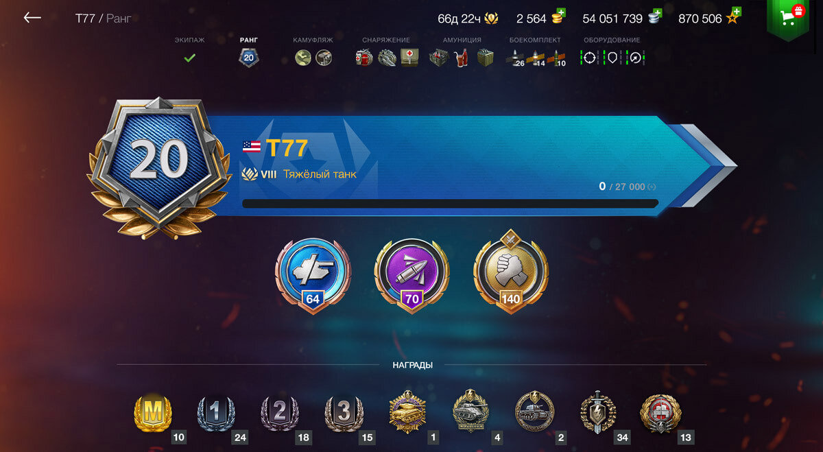 Что прокачать, когда на любимом танке уже всё прокачано? Ранг! Как показать всем, насколько хорошо ты знаешь свою боевую машину? С помощью Ранга! Когда Ранги появятся в игре? Скоро! Теперь с новым обновлением все смогут видеть твой ранг с начала и до конца боя в панели (сетке) с сетапом машин. Таким образом вы сможете показать насколько владеете рангом, сможете доказать какой вы командир. Проще - ранг показатель опыта игры на твоем любимом танке. Ранг повышается за счет медалей, количества урона нанесенного в бою, твоего поведения и порядочности, токсичности, а самое главное количества боев. Первым танком, который получит такую систему рангов станет новый американский барабанщик Т77. Ранги будут повышаться по количеству опыта, при этом свободный тратиться не будет. Когда линия опыта заполниться вы сможете купить ранг за серебро или кредиты (50000). Спасибо за чтение)