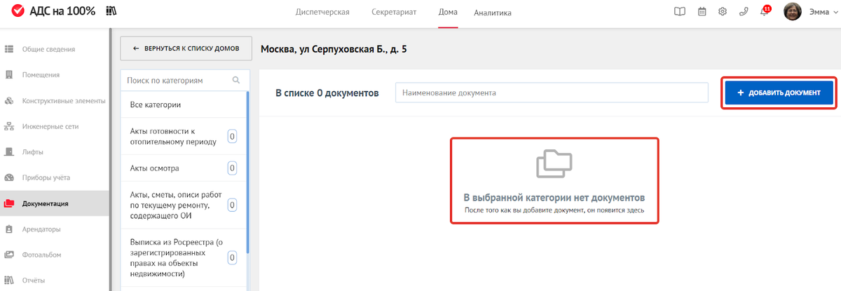 Если домов в управлении много, систематизировать информацию по каждому из них нелегко. Папки занимают много места, не всегда получается найти нужную информацию среди кипы бумаг. Сервис «АДС на 100%» позволяет загружать документы по дому, сразу же структурируя их по категориям: