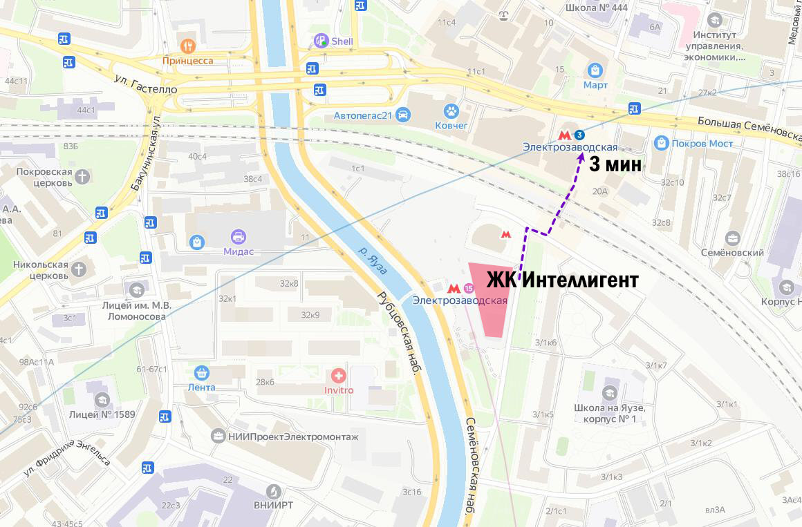 Кроме привычной синей линии метро, сюда пришла и розовая Некрасовская, которая впрочем скоро станет частью БКЛ (Некрасовская линия будет заканчивается у Нижегородской) А еще здесь есть жд станция Электрозаводская Все это входит в ТПУ Электрозаводская, да и сам ЖК Интеллигент (от Мосинжпроекта) появляется в составе этого ТПУ Рядом с выходом метро будущей БКЛ До станции м. Электрозаводская (синей, Арбатско-Покровская линии) можно будет дойти за 3 минуты, под жд путями сделан проход Кроме высококонцентрированного отборного общественного транспорта (две станции метро + жд станция) и его практической пользы здесь все хорошо и в моральном плане: ЖК Интеллигент появляется в Басманном районе ЦАО (пусть и на самой его границе) Автомобилистам должен открыться быстрый выезд на набережную ТТК и СВХ — формально 2 км, но выехать на хорду просто не получится, нет заезда (съезда) на Щербаковской улице. Придется покрутиться На последней карте вам может показаться, что именно рядом с будущим ЖК Интеллиг