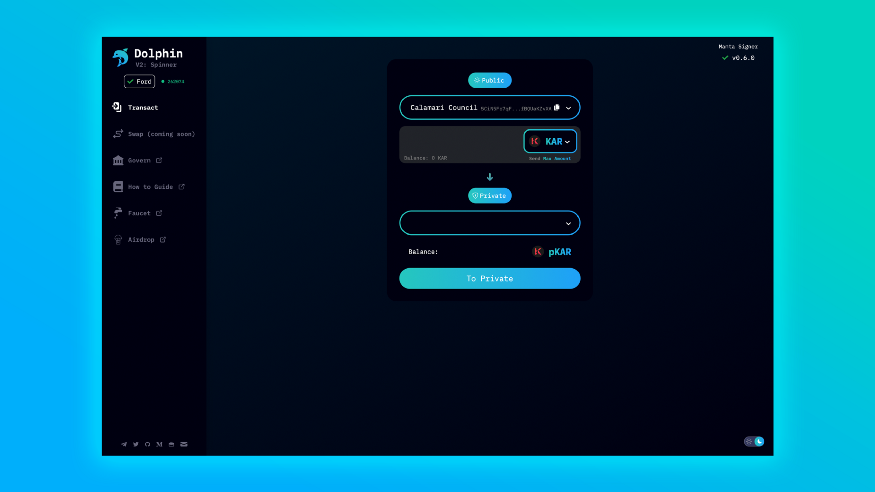 Dolphin v2 поощряется. Цель состоит в том, чтобы открыть тестирование для более широкого сообщества, чтобы не только получать отзывы от новых пользователей, но и демонстрировать конфиденциальность в Polkadot/Kusama людям, которые, возможно, не слышали о Manta или Calamari в прошлом.