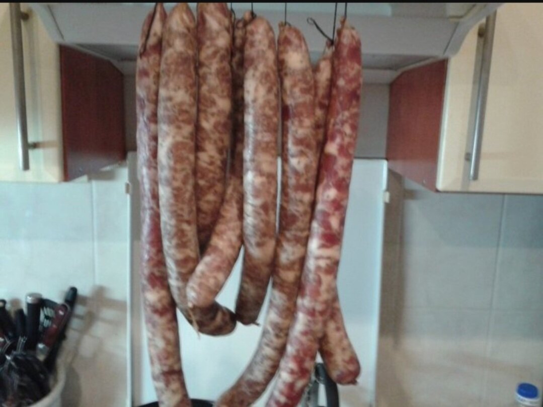 Колбаса пальцем пханая белорусская. Ингредиенты тазобедренная часть (кумпяк) кишки (у нас в гипермаркете есть) тмин перец черный чеснок кориандр соль сало Пошаговый рецепт приготовления Нарезаем мясо примерно сантиметровыми кубиками. Замачиваем и моем кишки. Сало перекручиваем крупно на мясорубке. Специи слегка обжариваем на сковороде. Смешиваем мясо, сало и специи, добавляем чеснок. На килограмм мяса потребуется 200 граммов сала, 30 граммов соли для сыровяленой и по вкусу для жареной колбасы. Остальное-по вкусу. Если колбасу собираемся жарить - добавляем воду и вмешиваем ее в фарш. Оставляем его на холоде на 12 часов (для сыровяленой на трое суток). Далее-набиваем кишки фаршем, прокалываем иголочкой в тех местах, где собрался воздух. Вешаем в сухом холодном месте на пару - тройку недель, а после на недельку над газовой плитой или жарим, парим, варим.