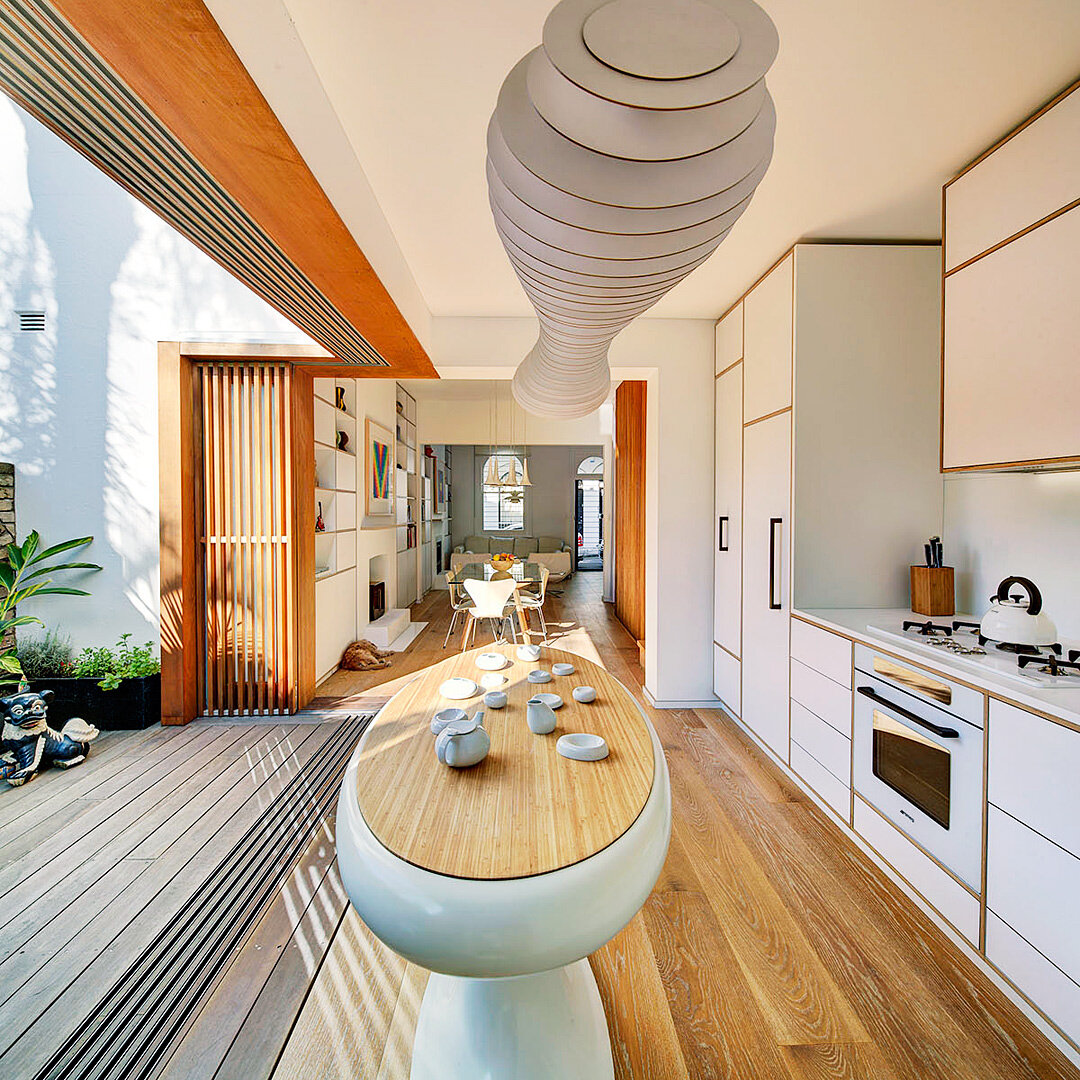 Фото: Brett Boardman Изначально авторам проекта досталась квартира 80-х годов прошлого столетия. Сразу было решено провести реконструкцию, снести внутренние стены и организовать террасу со стороны внутреннего дворика. В итоге пространство стало более функциональным, появилось больше света, а каждый элемент дизайна теперь выполняет несколько функций. Новые деревянные полы объединяют столовую, жилую и кухонную зоны в одно непрерывное пространство. Жилая площадь простирается во двор благодаря раздвижным окнам и деревянным экранам, которые волшебным образом скрыты от глаз, но дают затенение и уединение, свет и воздух. Новая кухня находится в центре и оснащена уникальным островом. Традиционная ступенчатая геометрия холодильника, духовки, шкафов и вытяжки была перестроена, чтобы создать обтекаемый вид. Обеденная зона располагается чуть в глубине дома. Хранение организовано вдоль всех возможных поверхностей - от пола до потолка в столов