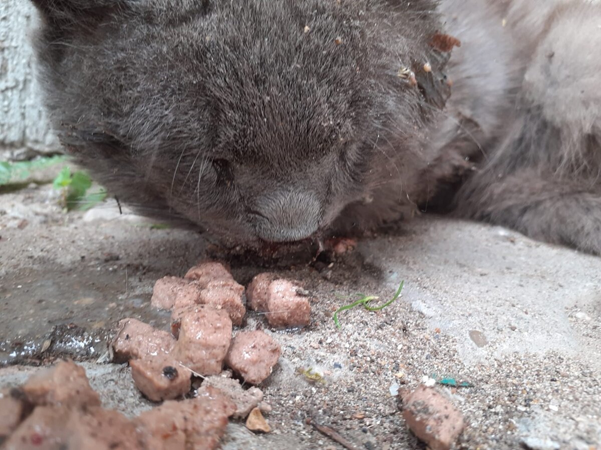 В таком состоянии кота сегодня нашла девушка. Он лежал без движения и надо было присматриваться, чтобы убедиться, что он еще жив. Кто-то "заботливо" размазал по тротуарной плитке жидкий корм прямо под носом. Понятно, что никто с собой тарелку не носит, но все же выглядело это не очень заботливо. Срочно разместили пост на стене нашей группы ВК Десятки котят на улице не могут попасть на передержку, так как на летний период наш город как будто уснул, сплавив своих жителей в огороды, деревни, лагеря и отпуска. А тут кот... Огромный, матерый. НО!!! Серый сейчас нуждается в помощи не меньше любого малыша. Разнообразия фото не будет, потому что сдвинуться с места у кота сил нет, да и любое движение доставляет ему адскую боль. Кот нашел одно положение, когда боль становится минимальной, и сидит в нем уже Бог знает сколько. Как всегда, мы не знаем, как он получил свои травмы. Визуально волонтеры определили только разбитый нос, глаза открываются, кстати они безумно красивого серого цвета, но