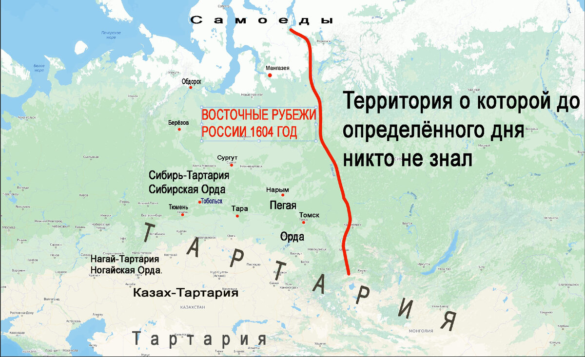 Для демонстрации, что Сибирская Тартария (Сибирская Орда, а по современному Сибирское ханство) входит в состав России в 1587 году, в 17 км от столицы Сибирской Тартарии, был основан город Тобольск. А с 1590 года Тобольск становится одним из центров по освоению Сибири и Дальнего Востока. После освоения, неизвестных Европе, дальневосточных земель, и до Русской Америки, в 1708 году город Тобольск становится административным центром всей этой территории. Но это будет потом, а пока...