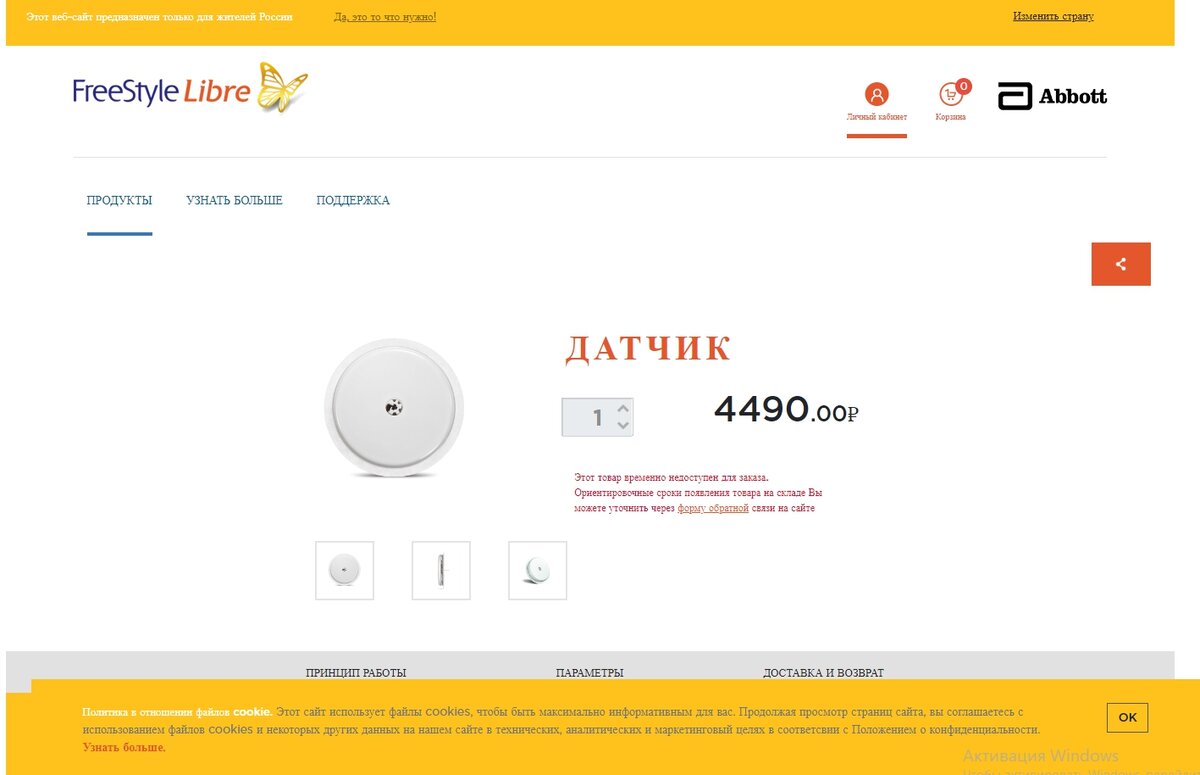 Последние дни моя личка просто разрывается от звонков и вопросов, где купить датчики FreeStyle Libre, почему их не продают. Попыталась разобраться в этом вопросе. Пользователи систем непрерывного мониторирования глюкозы крови (НМГ) FreeStyle Libre столкнулись с тем, что купить датчики НМГ на официальном сайте невозможно. При попытке заказа появляется сообщение, что товар не доступен для заказа. Его нет на складах и когда будет, неизвестно. Я позвонила в службу поддержки, чтобы прояснить вопрос. Дозвониться мне удалось только с третьего раза. Точнее, линия по решению “остальных вопросов”, связанных с продукцией FreeStyle Libre, то ли не слышала меня, то ли делала вид, что не слышит, а линия по вопросам работы интернет-магазина и заказов была не доступна. Повезло получить ответ от гарантийной службы. Менеджер сообщила, что: Запись разговора с представителем гарантийной поддержки FreeStyle Libre размещаю. Дальше я пошла в указанные интернет-магазины, чтобы проверить, есть ли там датчики.