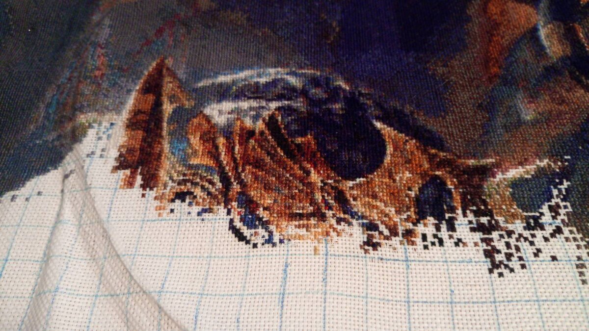 Всем привет, я ненадолго всплыла из небытия и решила показать, чем же таким я занималась, пока в этом самом небытии пребывала) А занималась я тем, что вышивала Бастет. Полностью сосредоточилась на этом процессе и вышивала только ее. Хотела дойти до правого края вышивки и только потом выложить сюда результат, но при нынешнем темпе вышивания ждать придется до первого снега, поэтому решила выложить как есть. И сейчас я уже добралась до головы и у меня даже показался кусочек короны: Еще немного и дойду до лица, хотя немного - это кромко сказано. В этой короне такая мешанина из одиночек, что вышивала я ее несколько недель, плюясь и матерясь отборной нецензурщиной. Но самое обидное, что эти одиночки ложатся криво и мешанина эта еще и выглядит так себе. Ну да ладно, зато самые сложные куски схемы почти позади. Осталось дошить корону и жизнь наладится, все пойдет как по маслу и можно будет шить со спринтерской скоростью. Самые кошмарные - это светлые участки, там где типа на волосы падает све