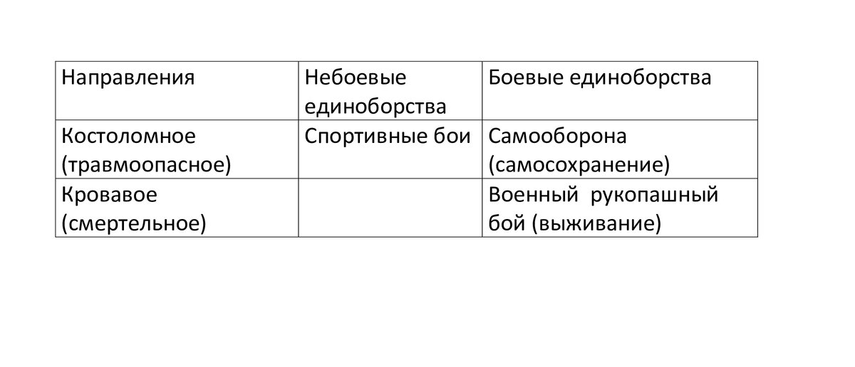 Из Таблицы видно, что у Единоборств три вида: спорт, самооборона и рукопашный бой (военный). Единоборства – это поединок один на один. Спорт – это физо+воля. Самоборона – воля+ум (тактика)+психика. Рукопашный бой – физо+воля+психика.