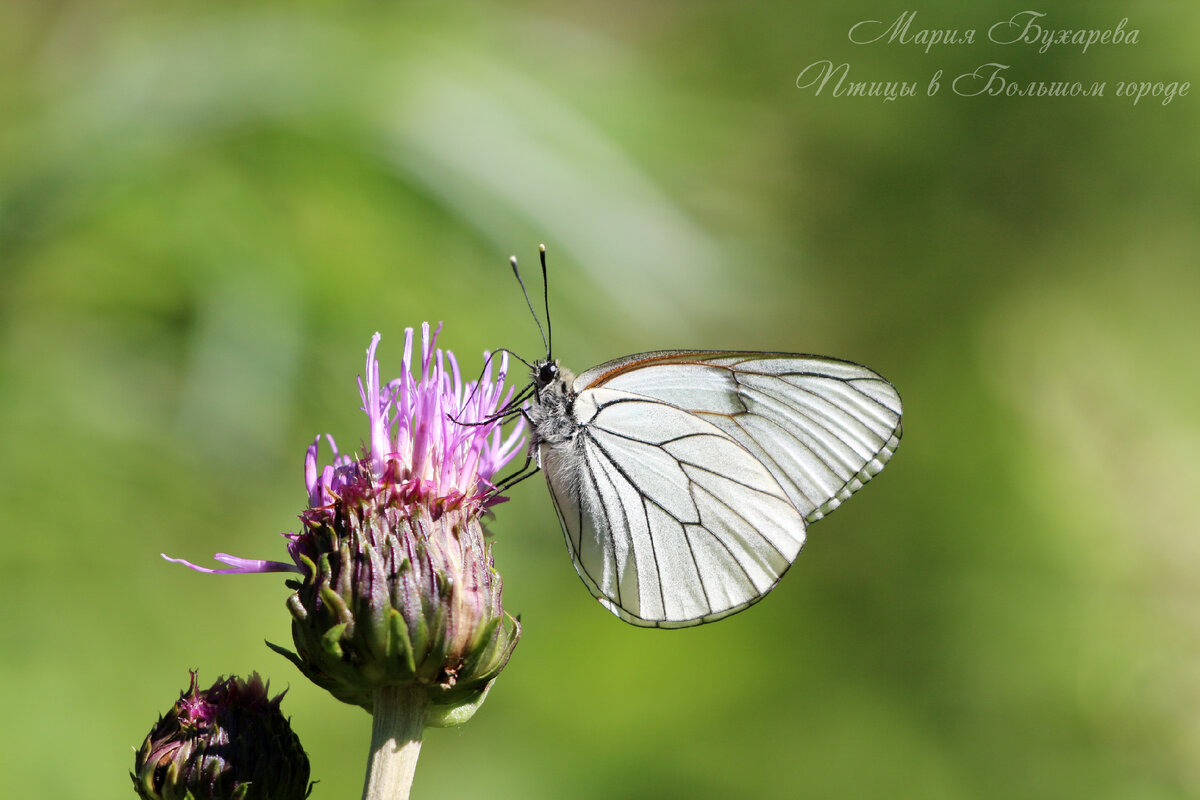 Ленинградская область, тропа Хо Ши Мина, июль 2022. Во время прогулки в поисках чернозобой гагары нам попадались самые разные бабочки, и в этот раз я вдоволь насмотрелась на боярышниц. Они довольно крупные, белые, с чёрными прожилками. На тропе их можно было наблюдать каждую минуту - никогда не встречала такого скопления. Вот эта красавица довольно долго мне позировала, хотя бабочки нередко стараются побыстрее улететь. Мне даже удалось снять видео, как она орудует своим хоботком, так что обязательно его загружу. В последнее время меня всё больше интересуют не только птицы, но также бабочки и стрекозы, и удачному кадру я всегда рада. Приглашаю подписаться на мой канал в Telegram: Также рекомендую сообщество коллектива авторов «Ушами филина» Вконтакте с образовательными и развлекательными публикациями из мира живой природы Петербурга и Ленинградской области: