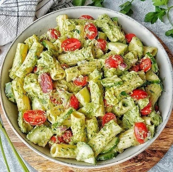 Ингредиенты: 🌿 220 гр вашей любимой пасты/макарон 🌿 Тонко нарезанный огурец без косточек 🌿 Нарезанные помидоры черри 🌿 Мелко нарезанный маленький красный лук 🌿 2 ст.л. нарезанной петрушки, для украшения 🌿 Перец молотый ⠀ ЗАПРАВКА: 🍋 2 авокадо 🍋 Сок 1 лимона 🍋 1 ч. л. соли 🍋 1/2 ч.л. перца 🍋 1 ч. л. чесночного порошка 🍋 Хлопья чили по вкусу 🍋 2 ст.л. петрушки + 2 ст. л. кинзы (или по вкусу) Приготовление: Сварите пасту до состояния аль денте в подсоленной воде. Слейте воду и сбрызните небольшим количеством оливкового масла (не используйте масло, если хотите). Все ингредиенты для заправки смешайте в кухонном комбайне/блендере. Добавьте в пасту все остальные ингредиенты и заправку. Тщательно перемешайте ⠀ ПРИЯТНОГО АППЕТИТА