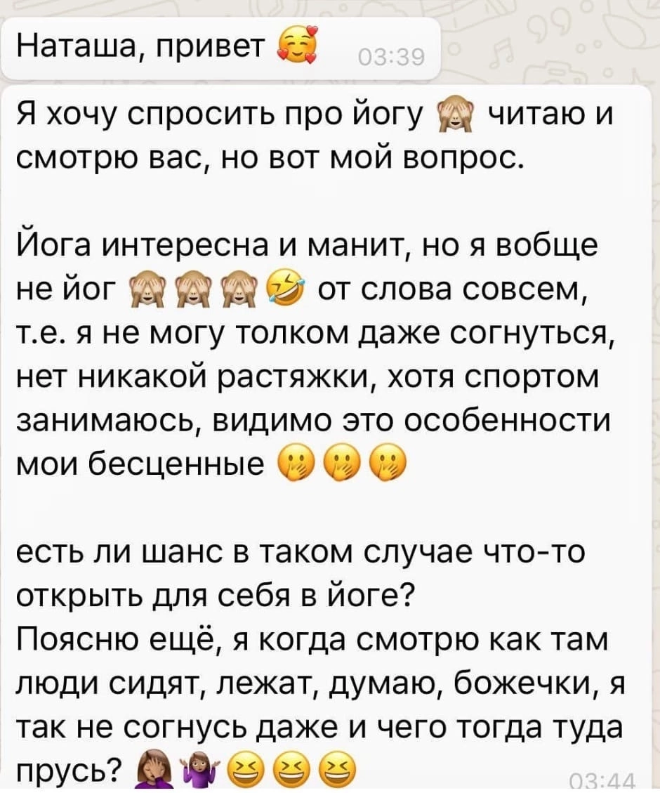 Внизу скрин вопроса, который настолько мне близок, что я решила ответить на него для вас всех Физиологически у меня совсем негибкое тело, жесткая, слегка скруглённая спина. А к 35 годам ситуация совсем стала грустной в этом плане. ⠀ Нагнуться, прогнуться - все это было для меня недоступно несмотря на регулярный спорт с моей жизни. Ну и я сама пренебрегала заминкой и растяжкой после тренировки, потому что какой смысл что-то там растягивать, если ничего не получается. И я просто продолжала усугублять ситуацию со своим телом, пока не оказалось, что просто сидеть с ровной спиной мне уже сложно. ⠀ При этом выглядела я действительно хорошо, все-таки спорт, режим сна и более-менее чистое питание творят чудеса. Правда телом ощущала, что мне уже не 18. Ну так мне и правда не 18😆 Но теперь имея опыт в йоге, я хочу сказать, что тем, кто считает себя деревянным в йогу надо идти в первую очередь, то есть чем быстрее, тем лучше. Для нас это, мягко говоря, жизненная необходимость. ⠀ Как бы мы не х