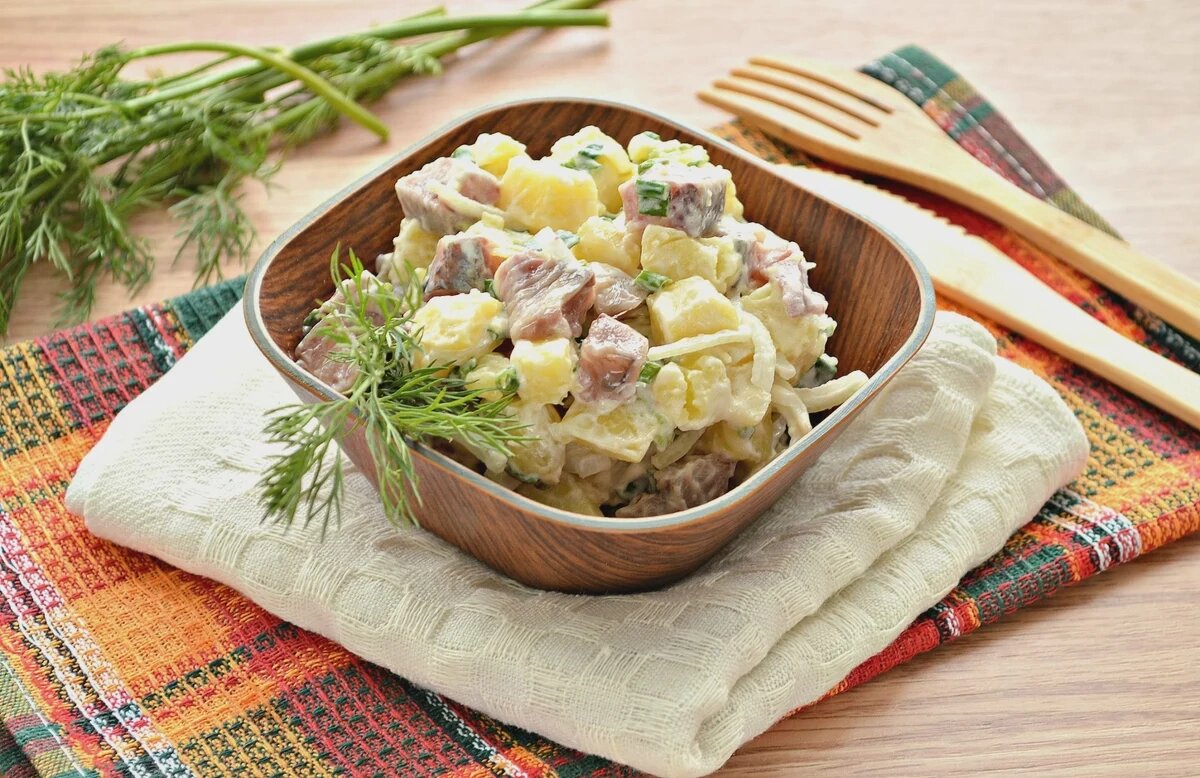 Картофельный салат с сельдью и зеленью Ингредиенты: 1 слабосоленая сельдь 5 картофелин 1/3 кочана салата айсберг 1 пучок укропа 3 пера зеленого лука 1 ч л горчицы с зернами 1 ст л растительного масла соль, молотый черный перец по вкусу Приготовление: 1 Картофель вымойте, заверните в фольгу и запекайте в разогретой до 180 градусов духовке 1 час. 2 Сельдь очистите и разделайте на филе, удалив все кости. Нарежьте небольшими кусочками. 3 укроп и зеленый лук измельчите. Листья салата вымойте, крупно порвите руками. Растительное масло взбейте с горчицей. 4 Смешайте картофель с листьями салата и зеленью, полейте заправкой, посолите и поперчите. Сверху выложите ломтики сельди и подавайте.