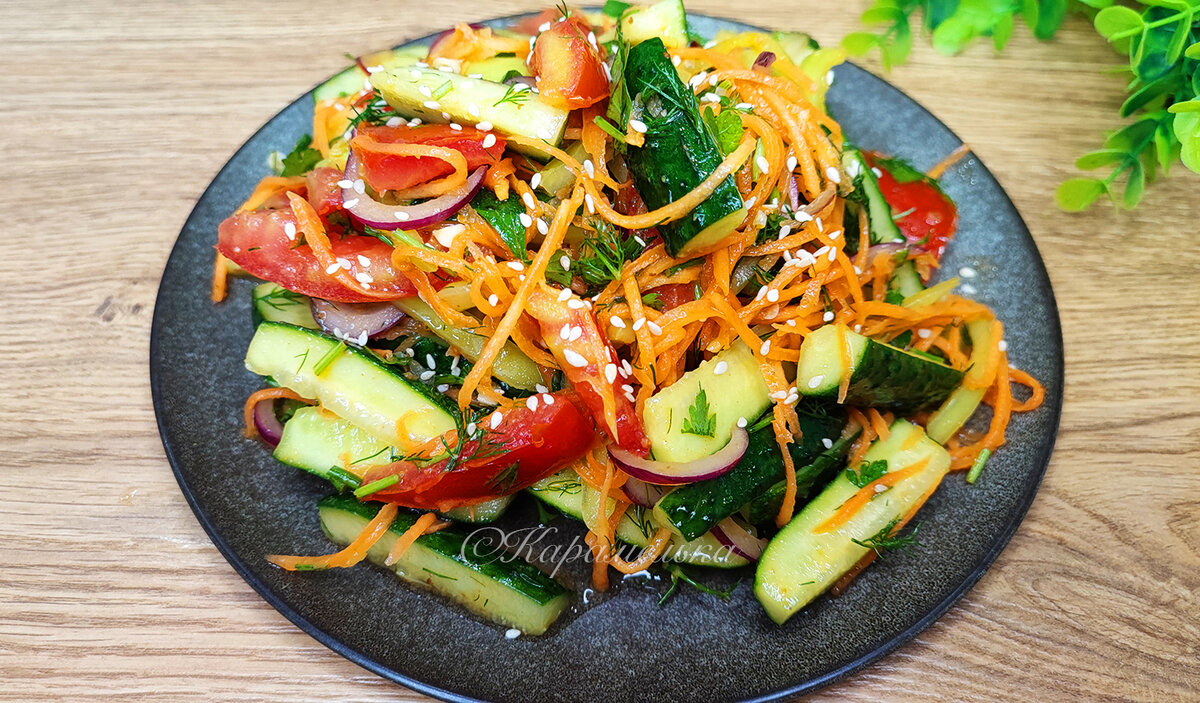 и необычного овощного салата, уверена, он вам точно понравится. Салат получается яркий, вкусный и с легкой пикантностью. Ну, что давай те уже приступим к приготовлению! 📌Для приготовления нам понадобятся следующие ингредиенты: Все овощи хорошо промываем и обсушиваем. Огурец разрезаем пополам и нарезаем брусочками, а затем отправляем в чашу. Морковь натираем на терке для корейской моркови и отправляем в чашу к огурцам. У помидора удаляем мякоть, нарезаем соломкой и отправляем в чашу к овощам. Болгарский перец нарезаем соломкой, а салатный лук перьями, измельчаем зелень и отправляем в чашу. Кучкой насыпаем кориандр молотый, острый перец и чеснок пропущенный через пресс. В сковороде хорошо прогреваем растительное масло и заливаем специи
