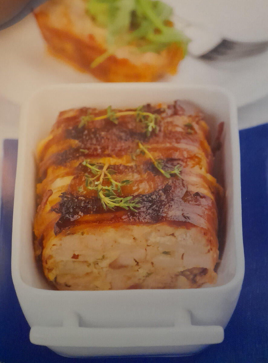 Террин (фр. Тетпе] — глиняная форма с крышкой для запекания паштетов и само блюдо, которое в ней готовится. Все В Луч ших традициях французской кухни. Террины готовят из всех видов мяса, рыбы, даже из овощей. По сути, это довольно крупно рубленный фарш с травами и специями, спрессованный и запеченный. Готовится в большом количестве жиров: заливается ростопленным сливочным маслом или утиным жиром, оборачивается в жирный бекон или прослаивается салом — сытное зимнее блюдо. Подается холодным на следующий день после приготовления. Время приготовления: 3 ч Количество порций 6-8 Ингредиенты: ● 2 кгмяса кролика ● 200 гсвежего свиного сала ● 200 гсырокопченого бекона ● яйца ● 150 гчерствой белой булки или тостового хлеба ● 200 мл молока ● 250 мл белого сухого вина ● 1 головка репчатого лука ● 0-7 веточек свежего тимьяна ● морская соль, черный свежемолотый перец — по вкусу Варианты приготовления После окончания готовки террину обязательно необходимо дать настояться в те