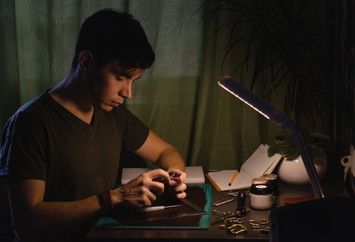 Всем привет! Зовут меня Алексей, уже лет пять делаю изделия из кожи. За все время работы попробовал много различных техник и направлений. Сейчас потихоньку прихожу к тому, что действительно нравится. Здесь буду публиковать особенности работы ремесленника, рассказывать про нюансы изготовления изделий и просто делиться тем, что нравится. Все работы делаю вручную, полностью. От раскроя и обработки кожи, до шва. Кожу использую КРС, итальянского и нашего производства. Из особенностей, это, как принято говорить, натуральная кожа. Хотя термин не верный, просто народный. :) Суть в том, что на коже нет лака или других полимерных покрытий, обрабатываю специальными воско-жировыми составами, чтобы сохранить верхний, самый прочный и красивый слой кожи (full-grain leather). Основное направление - галантерея (сумки, ремни, кошельки, обложки). Ещё увлекаюсь стрельбой из лука и иногда делаю лучное снаряжение. Помимо этого люблю бушкрафт, хорошее кино, рок, игры, научпоп, пробую себя в фотографии и мечт