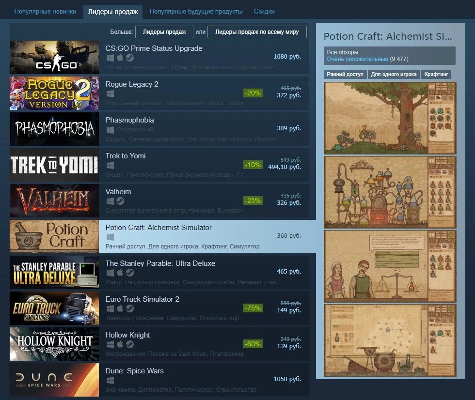 У издательства tinyBuild и российского разработчика niceplay games сегодня праздник. Несмотря на то, что Potion Craft в ранний доступ выходила еще 21 сентября 2021 года и в целом все еще в нем находится, она все же смогла в данный момент занять 6 строчку в лидерах продаж в Steam. Не знаю, совпадение или нет, но вчера у Куплинова выходило видео по игре. Возможно, это и дало игре новый поток продаж. Вообще успехи у Potion Craft и правда внушительные. В данный момент у нее уже более 9400 отзывов в Steam, где 93% положительные. Думаю уже совсем скоро игра попадет в тот весьма небольшой список российских разработчиков, кто смог преодолеть планку в 10к отзывов. Рекордсменом среди платных игр по моим личным наблюдениям все еще является Loop Hero. У него уже 25к отзывов в Steam. А если мы вспомним еще и бесплатные игры, то тут уже лидерство за Бесконечным летом, у которого более 56к отзывов в Steam. Ссылка на Potion Craft: https://store.steampowered.com/app/12103…