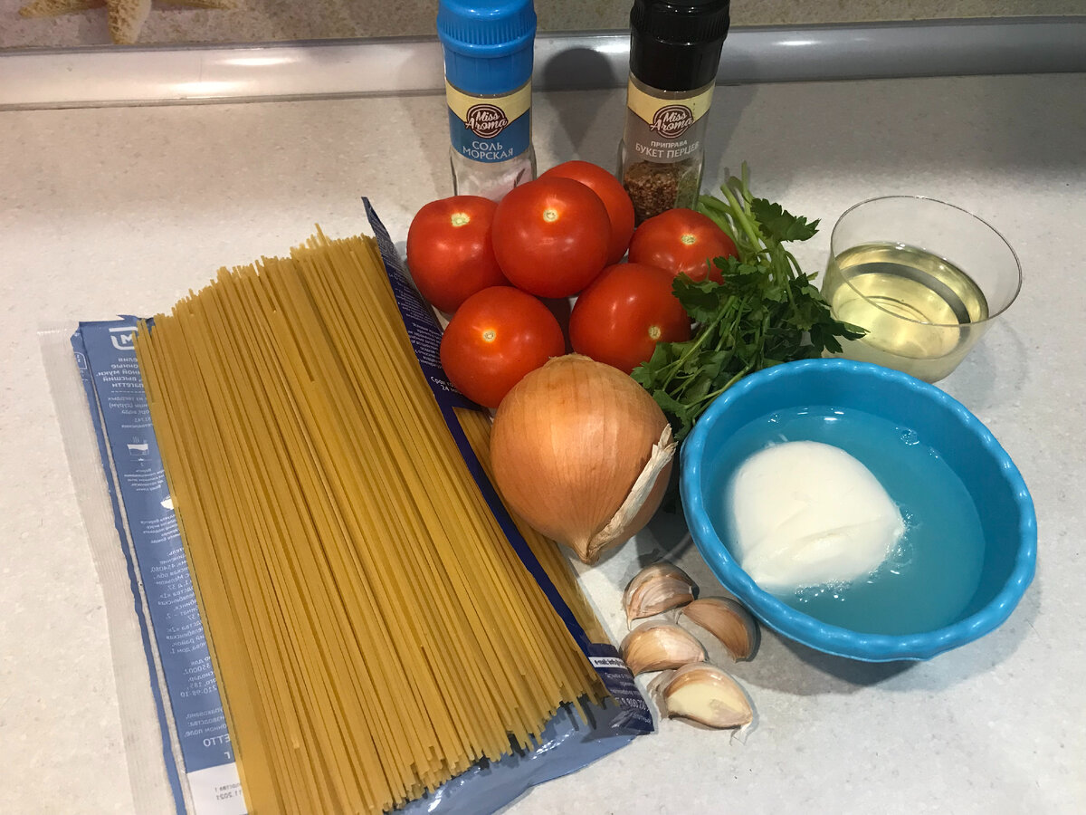 Спагетти с помидорами и сыром можно приготовить всего за 15 минут. Это идеальное блюдо для обеда или ужина. Продукты можно добавлять и заменять, получая новые сочетания и вкусы. Начнём приготовление. Мои ингредиенты для приготовления: 1. Чеснок и луковицу очистила, ополоснула под холодной водой вместе с петрушкой. Чеснок и лук измельчила, петрушку нарезала не очень крупно. 2. Если у вас большой шарик моцареллы, нарежьте его кубиками. У меня шарики маленькие, я разрезала их на 4 части. Помидоры ополоснула и измельчила. 3. В сковороде разогрела растительное масло. Отправила обжариваться лук до золотистого цвета. положила помидоры и чеснок к луку. Обжарила 5 минут на среднем огне. 4. Посолила томатный соус, добавила молотый перец и итальянские травы. Туда же выложила петрушку, перемешала, накрыла сковороду крышкой и тушила в течение 10 минут. 5. Спагетти отварила в подсоленной воде. 6. В сковороду с соусом добавила 1/2 моцареллы. 7. Выложила спагетти, перемешала. 8. Сверху распред