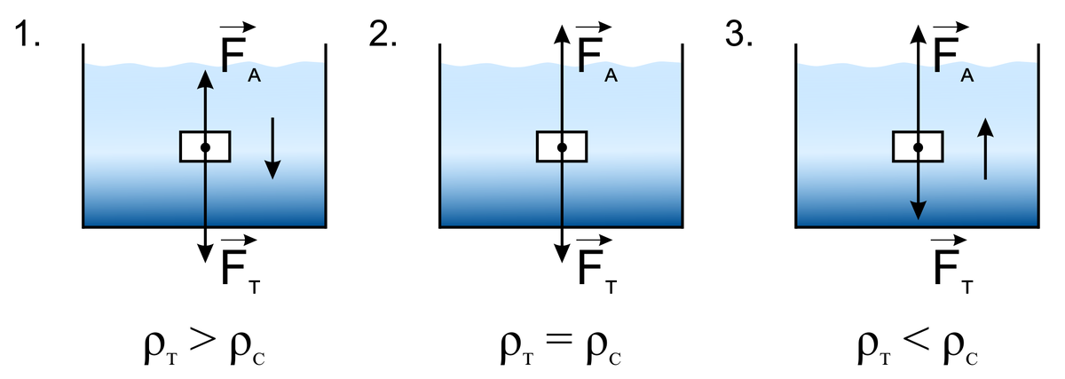 Все знают, что в воде плавать можно, даже те, кто плавать не умеет. Но что значит плавать? Давайте разберемся. На погруженное в воду тело действуют две силы: сила тяжести Fт и сила Архимеда Fа. Первая тянет тело на дно, вторая выталкивает из воды. От их соотношения зависит конечный результат. Если победит сила тяжести, тело утонет и заляжет на дно. Если «канат» перетянет на себя сила Архимеда, то тело всплывет и будет бесцельно (или с целью) болтаться на поверхности воды. Большинство считает, что такое состояние и есть плавание. И они правы. Но что если силы равны? Понятно, что в этом случае тело не всплывет, но и не утонет. Что же оно будет «делать»? Правильный ответ: плавать. Да-да, не удивляйтесь, именно плавать —только не на поверхности воды, а в ее толще на той глубине, куда его изначально поместили. Таким образом, возможны три ситуации (смотрите рисунок). Первая реализуется, если Fт > Fа (плотность тела больше плотности среды ρт > ρс); вторая — если Fт = Fа (плотности тела и