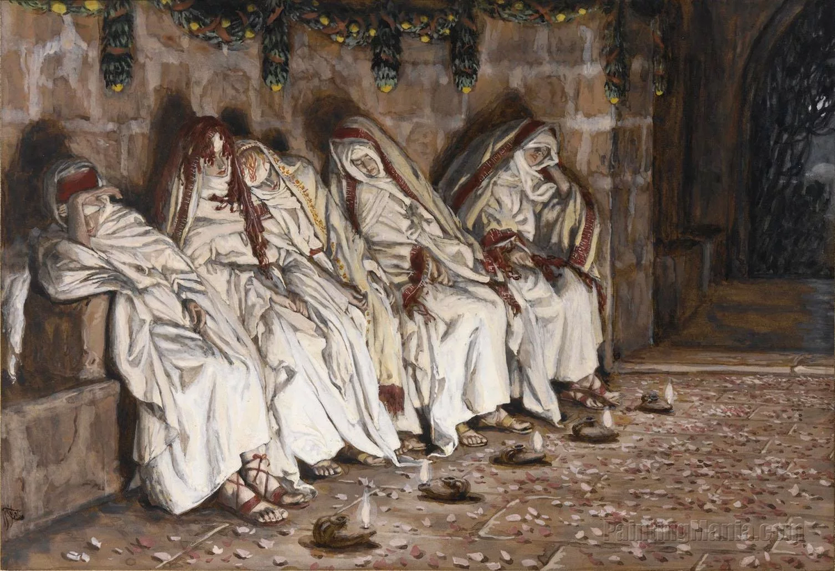 Случилось так, что в одном селении была свадьба. Пока жених и невеста со своими родственниками и друзьями веселились в доме невесты, десять девушек отправились на свое место, в прихожую в доме жениха, готовые выйти ему навстречу, как только далекий звук кимвалов и пения известит о том, что жених и невеста покинули дом невесты, чтобы пойти в дом жениха. Однако пир в доме бракосочетания затягивался, и наступила ночь.