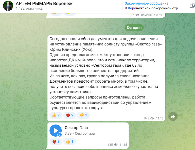 Сегодня 22-я годовщина со смерти Юрия Хоя. В Воронеже снова заговорили о памятнике музыканту. Это уже не первая попытка. Предыдущая не увенчались успехом. В частности причиной отказа были не достаточно правильно оформленные документы. Но активисты не сдаются. И в этот раз, вероятнее всего поклонники получат своё. В телеграм-канале депутата Воронежской госдумы Артема Рымарь 4 июля 2022 г. был опубликован пост о начале сбора всех необходимых документов. Мэрия Воронежа вновь поддержала и в этот раз предложила провести открытый конкурс на лучший проект памятника. Место для установки памятника предполагается в сквере рядом с ДК им. Кирова, как сказано в посте выше. Но более понятно будет, если я скажу - рядом с ВоГРЭСом, который упоминается в одном из хитов Сектора Газа. Поэтому, друзья мои, кому не безразлично творчество Юрия Клинских, следите за новостями и обязательно участвуйте! И, конечно, же не забывайте подписываться на канал Молния: мастерская Xev, где творчество не только в руках,