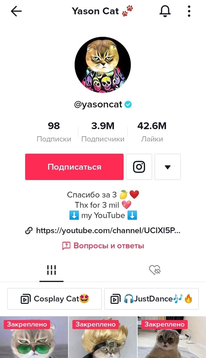 Доброго времени суток, дорогой читатель! Коты и кошки - самые популярные домашние питомцы в мире. И в этой статье вы узнаете о десяти самых популярных котах и кошках в тик токе. 10 место: @yasoncat Русскоязычный канал, на котором автор наряжает своего котика в разные костюмы и снимает это на камеру. Его кот прославился из-за необычной, "сердитой" внешности, набрав 3,9 миллиона подписчиков и 42,6 миллиона лайков. 9 место: @furryfritz Иноязычный канал, так что к сожалению в связи с блокировкой тик тока я не могу узнать о чём именно снимает автор данного канала, так как в России иностранные видео в тик токе теперь не показывают. ВПН в данном случае не помогает(. По подписчикам этот канал не сильно обгоняет предыдущий, но вот лайков у него в три раза больше, целых 169,2 миллиона. 8 место: @mmeowmmia Ещё один иноязычный канал. Судя по аватарке и нику, канал посвящён двум кошкам, которых зовут Мия и Джерри. Кстати обратите внимание на глаза (я предполагаю Мии). Видно что эти кошечки смогли