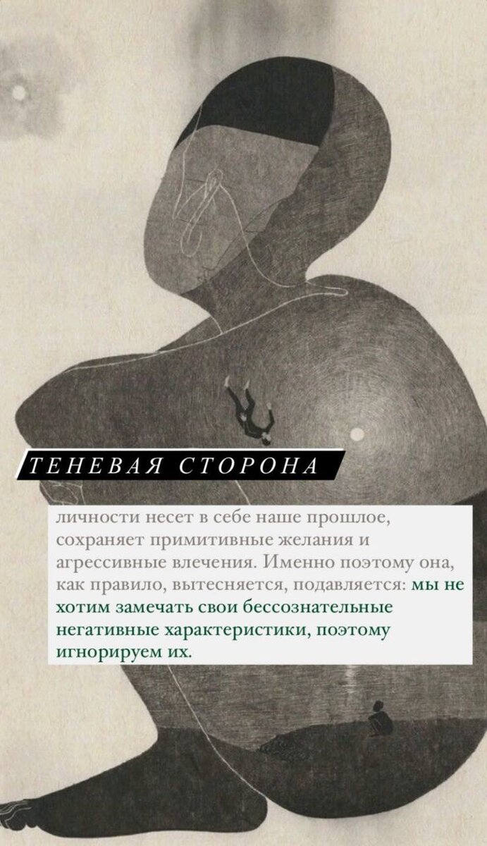 «Горе тем, что живет примерами! Нет жизни в них. Если вы живете в соответствии с примерами, вы живете жизнью этого примера, но кто будет жить вашу жизнь, как не вы сами? Так живите сами.» К.Г. Юнг «Тень, это то, что ты в себе не видишь, но можешь почувствовать», это вытесненная часть человека, это нереализованный потенциал, который недооценивают и фрустрируют. Каждый имеет свою индивидуальную Тень, и она почти всегда является наихудшей стороной личности. Существуют исключения из этого правила, встречающиеся у человека, осознание которых подразумевает, что Тень является олицетворением лучшей стороны (например, в детстве ребёнок был наблюдательным, а это было неудобно, много вопросов, тогда это подавляется). Чувствительный добродетель имеет брутальную эгоцентрическую Тень, смелый- трусливую Тень, скромность - похотливость в Тени. Больше о юнгианстве 👆🏻 Осознание Тени — путь понимания других, интуитивного восприятия отношений в обществе, внутри семьи, в партнёрских отношениях. Осознани