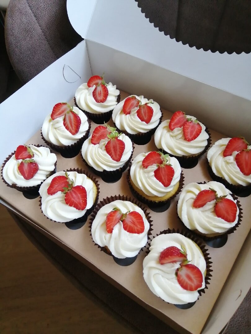Здравствуйте, дорогие читатели. В свободное от хозяйства и работы время люблю немного покулинарить. Пару дней назад нас с мужем пригласили знакомые посидеть, чаю попить. Приготовила всеми любимые в нашей семье лимонные капкейки. Я часто ими заменяю торт, потому что они очень вкусные, с ними меньше возни и смотрятся празднично. Коробка для 12 капкейков у меня уже была, клубнику последнюю сорвала и вуаля. Рецепт приготовления (12-14 штук для бумажных капсул с диаметром дна 5 см): Яйца, соль и сахар, который вводить порциями, взбить ручным миксером примерно 3 минуты. Добавить масло, молоко, лимонный сок и цедру, перемешать до однородности. Ввести просеянную муку с разрыхлителем и перемешать миксером на низкой скорости. Получится достаточно жидкое тесто. Тесто выложить в бумажные капсулы примерно на 2/3. Раньше, когда у меня не было кондитерских конвертов, я тесто выкладывала ложкой. Выпекаем в предварительно разогретой духовке примерно 35 минут при 180 градусах. Все зависит от вашей духо