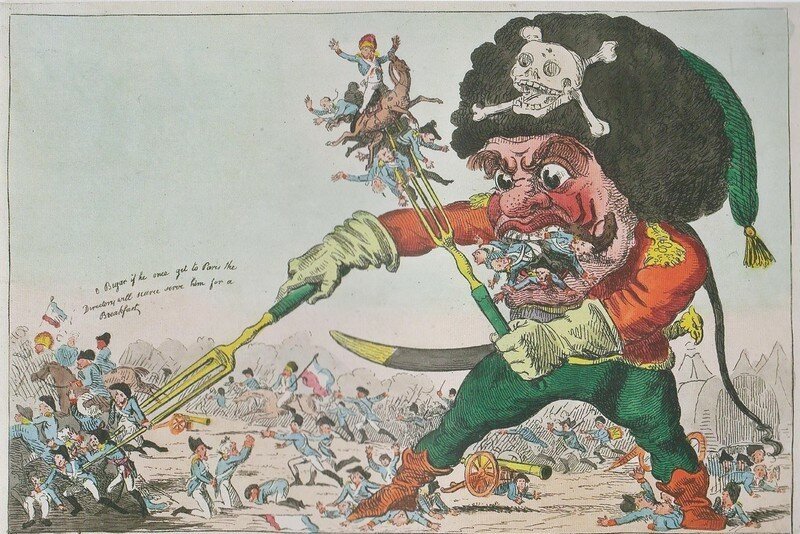 Тогда же в английской прессе появилась и первая карикатура, изображавшая довольно неприятного чернобрового усача, с надписью «General Suwarrow». Хотя имя-отчество генерала названо не было (да и никакого портретного сходства не имелось) сомнений в том, кто имеется в виду не возникало. С тех пор Суворова в Европе изображали именно так: грозным, с большой залысиной, торчащими в разные стороны усами и бровями и почти неизменно в казацкой папахе или шлыке. А фамилия, созвучная с английским «swallow» — «глотка», стала его распространенным в Европе прозвищем.