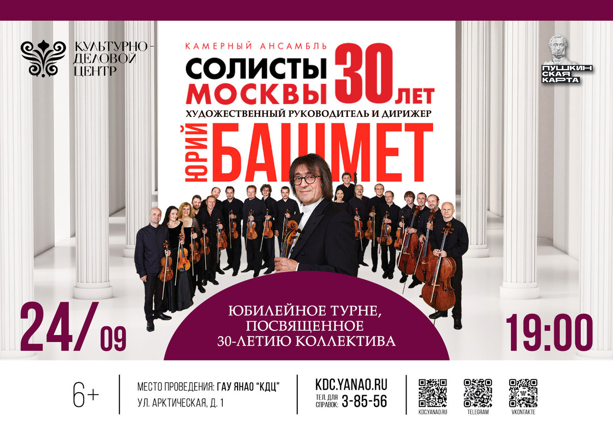 Выдающийся музыкант современности, Народный артист СССР, альтист, дирижер, педагог, художественный руководитель – Юрий Башмет и камерный ансамбль «Солисты Москвы», в рамках юбилейного турне, посвящённого 30-летию коллектива выступят в концертной программе 24 СЕНТЯБРЯ в 19:00 на сцене Культурно-делового центра.🤩 🔹Билеты доступны по Пушкинской карте! 🔹Купить билет можно в кассе и по ссылке: https://quicktickets.ru/salehard-kulturno-delovoj-centr/s288 🔹Справки по телефону: 3-85-56