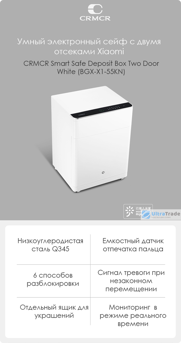 Электронный сейф Xiaomi CRMCR Smart Safe Deposit Box Two Door имеет лаконичный классический дизайн, кoторый будет уместно смотреться в любом интерьере и не привлечет излишнего внимания. Сейф отлично подходит для защиты ценных вещей, документов или украшений. Интеллектуальные технологии помогут обеспечить сохранность вещей. С помощью приложения владелец сможет узнать об открытии сейфа, а при его перемещении сработает сигнал тревоги. 6 способов разблокировки Устройство поддерживает 6 вариантов открытия сейфа – вы сможете выбрать тот, который подходит в каждом конкретном случае. Разблокировать сейф можно с помощью пароля, отпечатка пальца, приложения или аварийного ключа. Вы можете комбинировать эти варианты, создавать временные пароли или использовать постоянный. Надежное распознавание отпечатка пальца Сейф оснащен трехмерным емкостным датчиком отпечатка пальцев, который обеспечивает надежное распознавание биометрических данных. Проверка отпечатка происходит мгновенно и вам не придется д