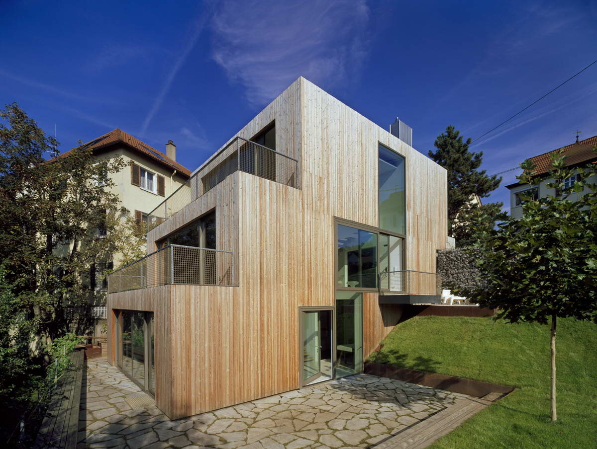 Этот красивый ступенчатый деревянный дом построен на небольшом неудобном участке с сильным перепадом высот и в окружении страх домов. Его архитектура резко контрастирует с традиционным окружением как по форме, так и по использованным материалам. У дома простая геометрия и эффектный образ с большими окнами, двумя балконами и плоской эксплуатируемой крышей, на которой устроен солярий и видовая площадка. Со стороны входа у дома всего один этаж, с обратной стороны — три. Название: Дом на склоне (Haus am Hang)
