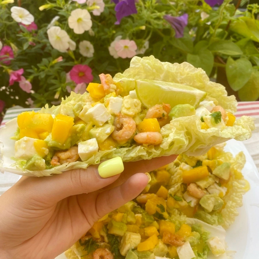 Порежьте на кубики: манго, авокадо, сыр и выложите их на листик айсберга. После полейте соусом, а поверх положите креветки и посыпьте кинзой. Кто любит поострее, может добавить перец Чили.