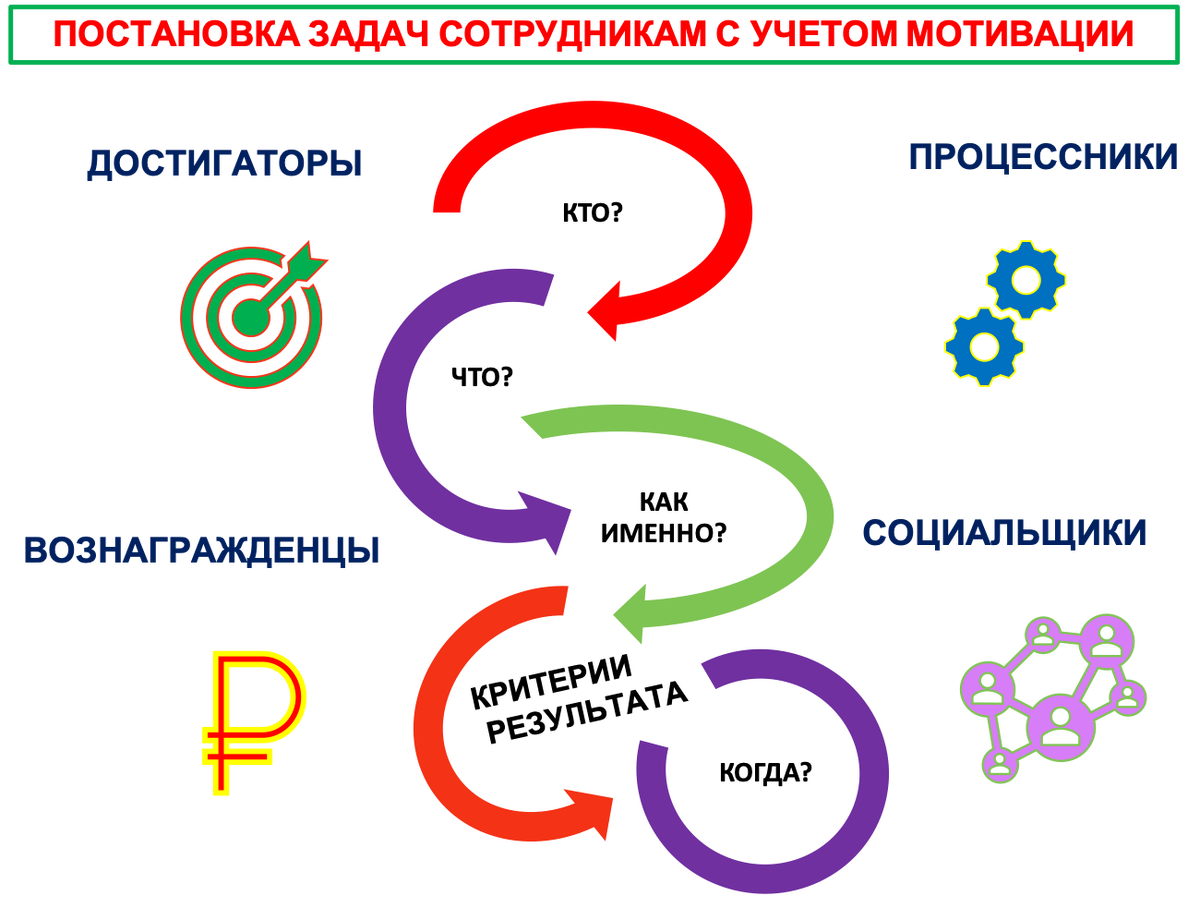 Часто в организации продаж возникает перекос. Руководитель либо круто мотивирует, основываясь на «go-go», либо ставит задачи без учета основ менеджмента. Как правильно ставить задачи, чтобы они выполнялись? 1. С акцентом на индивидуальную мотивацию. 2. По алгоритму, исключающему домысливание, искажение ожидаемого результата. 4 типа мотивации сотрудников. Социальщики-сотрудники, направленные на коллективные отношения, это они рисуют плакаты, вырезают снежинки, с готовностью общаются и поддерживают коллег. Постановка задач на тему: сделай и получишь вознаграждение, здесь не работает. Правильно говорить, я не смогу сохранить тебя в команде если ты не будешь выполнять конкретные задачи. Процессники-сотрудники, ориентированные на процесс, им должно быть интересно, при вопросе на входящем интервью такой сотрудник на вопрос: какую из наших вакансий вы предпочтете: среднеоплачиваемую в формате комфортного выполнения задач или сопряженную со стрессом, но с высокими премиями, выберет однозначн