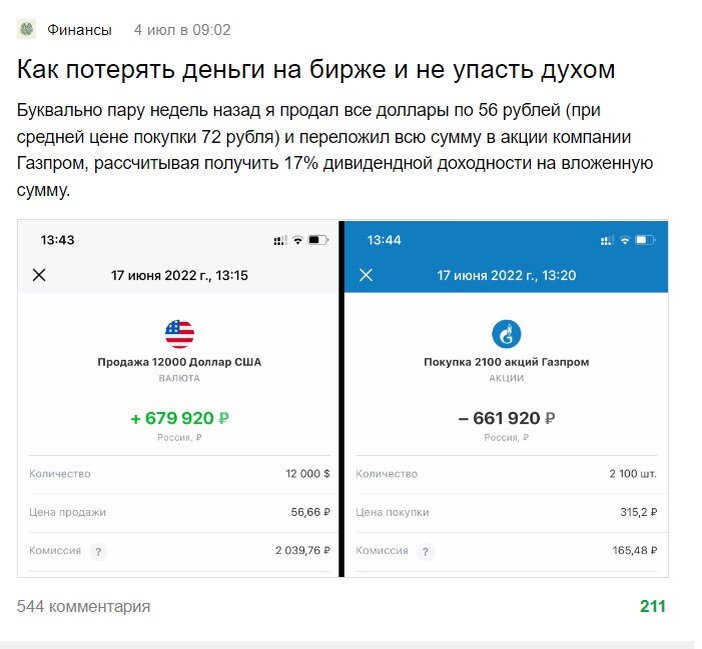 Попался мне на глаза пост, свежий, актуальный, и скорее всего, реальный, поскольку сопровождается скриншотами. Решил, что нужно обязательно этим поделиться со своими читателями. Долго томить не буду, смотрите сами. Я не знаю, как это комментировать. Злорадствовать, конечно, не стоит, но данному инвестору, мягко говоря, совсем не подфартило. Первой приходит на ум вот такая эмоция. Но давайте все же разберем, а что тут не так. Чем руководствовался данный участник рынка, и какие ошибки он допустил. Итак, ошибки кратко я опишу очень неожиданным образом. 1. Поверил государству. 2. Поверил государству. 3. Поверил государству. Все поняли, почему именно так? Если нет, поясню. Мы будем избавляться от доллара! Доллар ничего не будет стоить! Скоро все операции с долларом будут запрещены (или обложены огромными комиссиями)! Рубль - сила! Газпром - сила, потому что продает газ за рубли! Цена на газ заоблачная, мы получаем сверхприбыли от продаж! И этими сверхприбылями мы поделимся с вами, заплатив