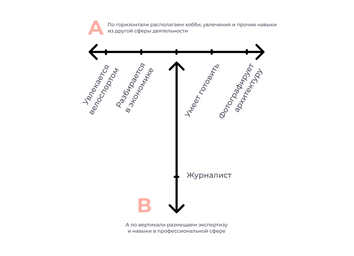 Ваши увлечения за пределами работы — ваше преимущество! Мир быстро меняется, и поэтому оставаться экспертом только в одной сфере становится опасно. Да еще и работодатели отдают предпочтение разносторонне развитым сотрудникам. Чтобы оставаться востребованным на рынке труда, нужно развивать не только профессиональные навыки, но и личные увлечения. И даже самые неожиданные хобби могут сыграть вам на руку при трудоустройстве. Уже довольно отчетливо заметен тренд на потребность в широкой специализации сотрудников. Например, копирайтер может написать текст, но не сможет нарисовать к нему картинку. А вот контент-мейкер уже и фото сделает, и видео снимет, да еще и текст напишет. T-shaped модель навыков показывает, насколько сотрудник многосторонне развит. Эта модель помогает HR-специалистам подобрать подходящего сотрудника. Например, компании Х нужен фотограф для съемки коллекций одежды для соцсетей. Как вы думаете, кого они выберут? А еще выбирать подходящие форматы подачи для каждой соц