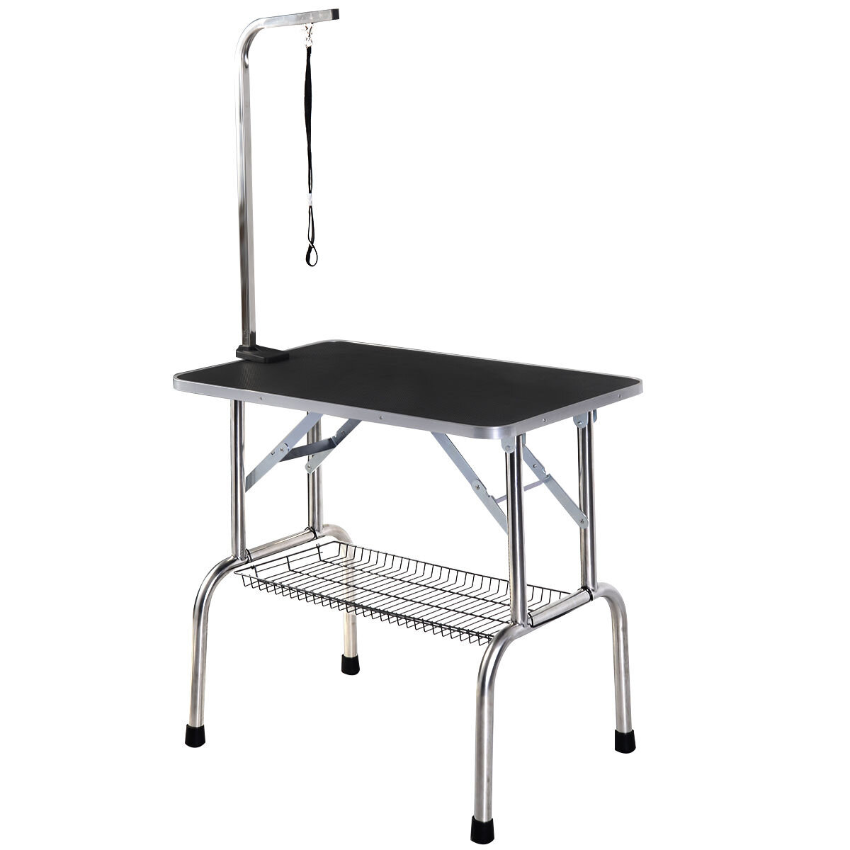 1.Грумерский стол с кронштейном. Размер столешницы следует подбирать в зависимости от того, с какими животными, а главное, с животными какого размера Вы работаете. Так же необходимо отталкиваться от площади рабочего помещения. Оптимальным для работы столом я считаю рабочую поверхность размером 90 на 60 см, оптимально для работы с мелкими и средними породами собак, а так же с кошками. Для крупных собак больше подходит стол около 120 на 70 см. Но если грумер работает на выезде, столы такого размера будут неудобны для транспортировки. Обычно на выезд подходят больше столы размером 60 на 45 см, со складывающимися ножками. Не малую роль играет и высота стола. Подбирать высоту рабочей поверхности следует, отталкиваясь от своего роста. Когда Вы стоите возле стола с опущенными вниз руками, столешница должна находится примерно посередине кисти опущенной вдоль тела руки. Кому-то комфортной будет высота 75 см, а кому-то все 95...Мы все разные. Можно, конечно, работать за любым первым попавшимся