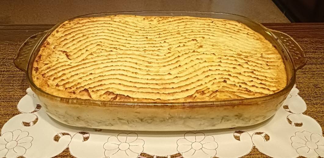 Ингредиенты: крупных картофелин, филе белой рыбы, средних белых луковицы, укропа, молока, сливочного масла (+ немного для смазывания), сливок 33%, средних яйца + 2 желтка, твёрдого сыра, муки, соль, белый перец молотый Способ приготовления: Картофель очистить, разрезать каждую картофелину пополам, сварить в небольшом количестве воды до мягкости, 20 мин. Слить воду, картофель растолочь в пюре. Слегка взбить яйца с желтками и жирными сливками. Смешать с пюре, посолить и поперчить. В сковороде с толстым дном растопить 3 ст. ложки масла, положить мелко нарезанный лук, на среднем огне обжарить, часто помешивая, до мягкости, примерно 8 мин. Добавить оставшееся масло, растопить. Всыпать муку, перемешать, обжаривать, помешивая, 2 мин. Влить молоко, тщательно размешать, увеличить огонь, готовить, помешивая, до легкого загустения. Посолить и поперчить, добавить мелко нарезанный укроп и перемешать. Нарезать рыбу небольшими кусками, выложить в смазанную маслом форму, залить молочным соусом с укроп