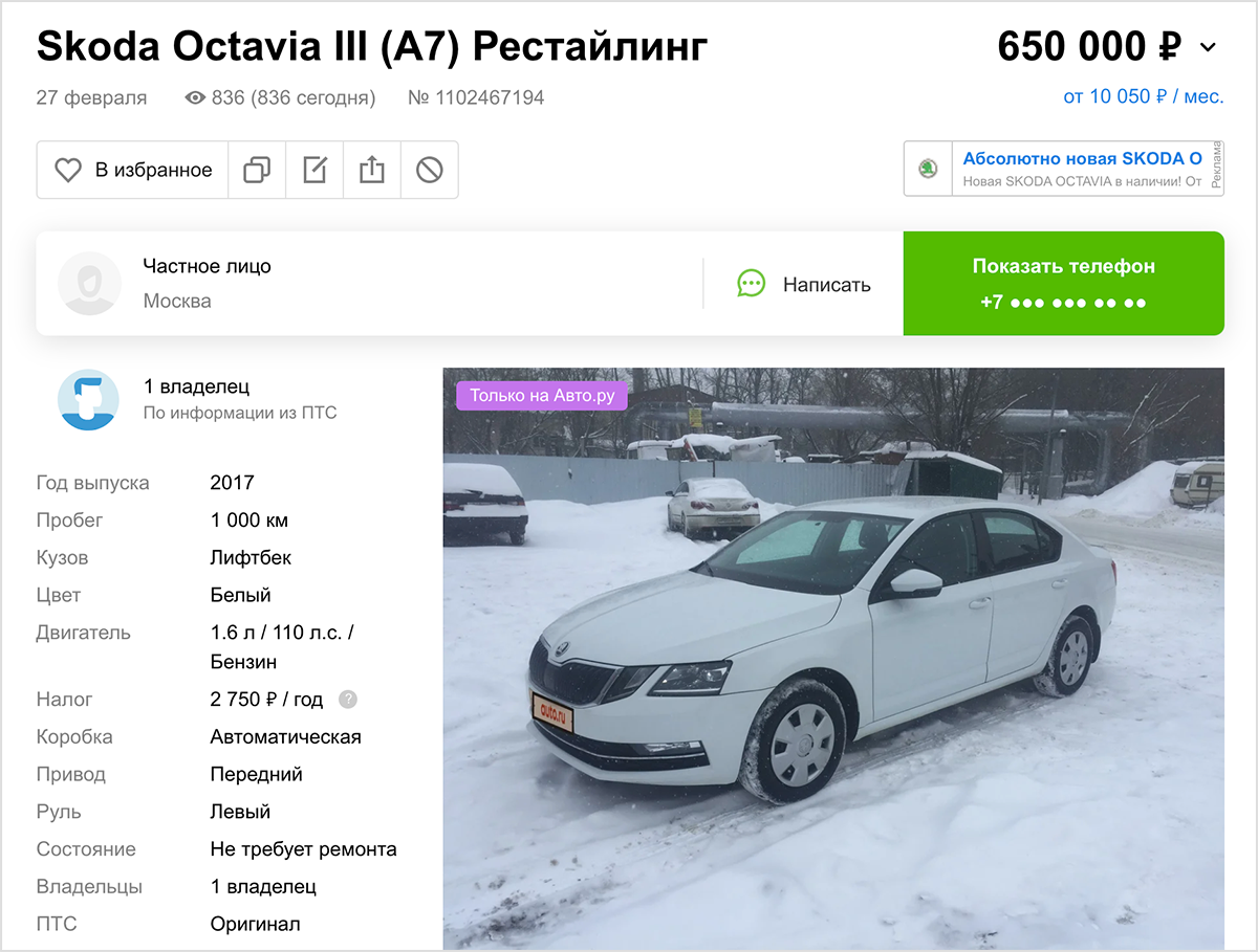 Большинство покупателей подержанных автомобилей ориентируются, в первую очередь на их возраст и величину пробега, выбирая среди множества предложений машины максимально свежие. И этим часто пользуются недобросовестные продавцы, скручивая одометры машин и пытаясь выдать их за «почти новые». Опытные автомобилисты знают, что «крученые» машины часто встречаются среди экземпляров определённой модели, модификации и даже цвета — среди автомобилей, поработавших в такси или каршеринге. Пробеги за год у них солидные, а эксплуатируют их не всегда бережно. Но потом наклейки с кузова снимают, одометр корректируют (порой — вообще без оглядки на здравый смысл) и выставляют такую машину на продажу как «почти новую». В рубрике «Не бит, не крашен» мы уже рассказывали про Ford Focus из таксомоторного парка, который пытались представить выгодным предложением. Но герой новой статьи — вот эта Skoda Octavia 2017 года выпуска — поражает ещё больше. Как вам пробег в 1000 км для автомобиля, которому уже