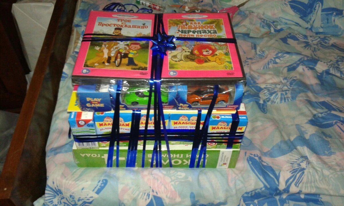 Всем привет! Многие родители, задумываясь, что подарить ребенку на праздник, покупают что-то весомое, но одно. А что если подарить большой подарок из маленьких и разных. Ведь ребенку будет очень интересно, что там внутри. Подойдет для детей до 7 лет. Итак сначала нужна основа торта-подарка, что-то плотное. Например комплект постельного белья с любимыми героями, годовой курс книжек для развития по возрасту. На него по кругу делаем бортики из чего хотите, главное, чтобы высота одна была. Я брала соки, машинки, пазлы, маленькие лего. Все зависит от вашего желания и бюджета. Красиво (а ни как у меня) все связываем ленточкой. Соки удобно связать по 2, машинки/пазлы на двухсторонний скотч. Внутрь того, что получилось, кладем что угодно, вкусняшки, игрушки, восковые мелки, детскую косметику, вещи, канцтовары, все, что хотите. Дальше закрываем все это чем-то тонким, можно книжкой, альбом с наклейками и снова делаем бортики. Слоев сколько угодно делаем. В конце бантик лепим
