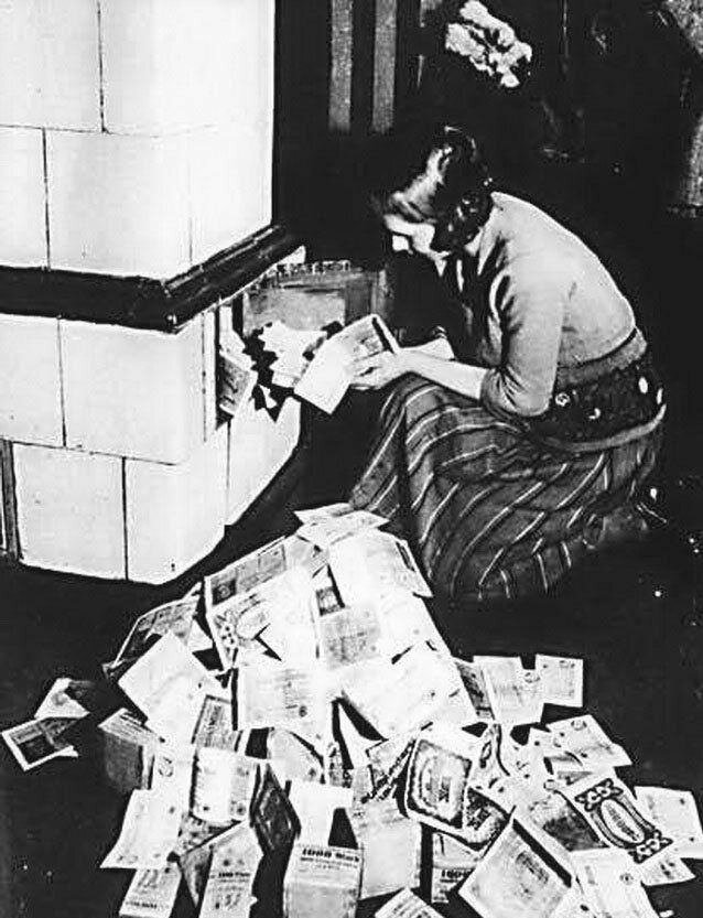 Наши "святые девяностые" - это детская песочница по сравнению с тем, что творилось век назад в Германии. Месячная инфляция временами достигала трех миллионов процентов, банкнотами оклеивали стены вместо обоев, а средняя инфляция равнялась 25% в сутки - в итоге цены за месяц вырастали в 800 раз. После очередной и "самой последней, правда-правда" деноминации один триллион марок обменивали на банкноту в одну новую марку.