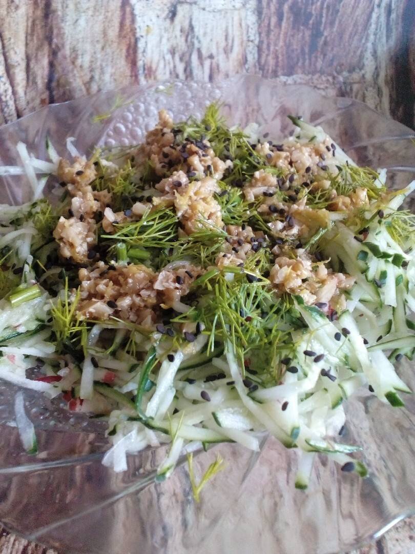 #вторник #летнийсалат #кукпадготовит С грузинского - весна, но и летом очень освежает. К тому же витамины. Вкусно, быстро и ароматно Ингредиенты: огурца, яблоко, чеснока, растительного масла, лимонного сока, зелень укропа , соль Способ приготовления: Из лимона выдавить сок. Яблоко помыть, натереть на тёрке для корейской моркови, сбрызнуть лимонным соком. Огурец помыть, натереть на тёрке для корейской моркови, добавить к яблоку. Чеснок почистить, помыть, пропустить через пресс или потереть на мелкой тёрке. Зелень помыть, обсушить, порубить. Все компоненты складываем в салатник, солим по вкусу и заправляем маслом. Я решила заправить салатной заправкой и посыпала черным кунжутом. Приятного аппетита. Буду рада видеть Ваш отзыв и Вас моим подписчиком, если понравился рецепт.